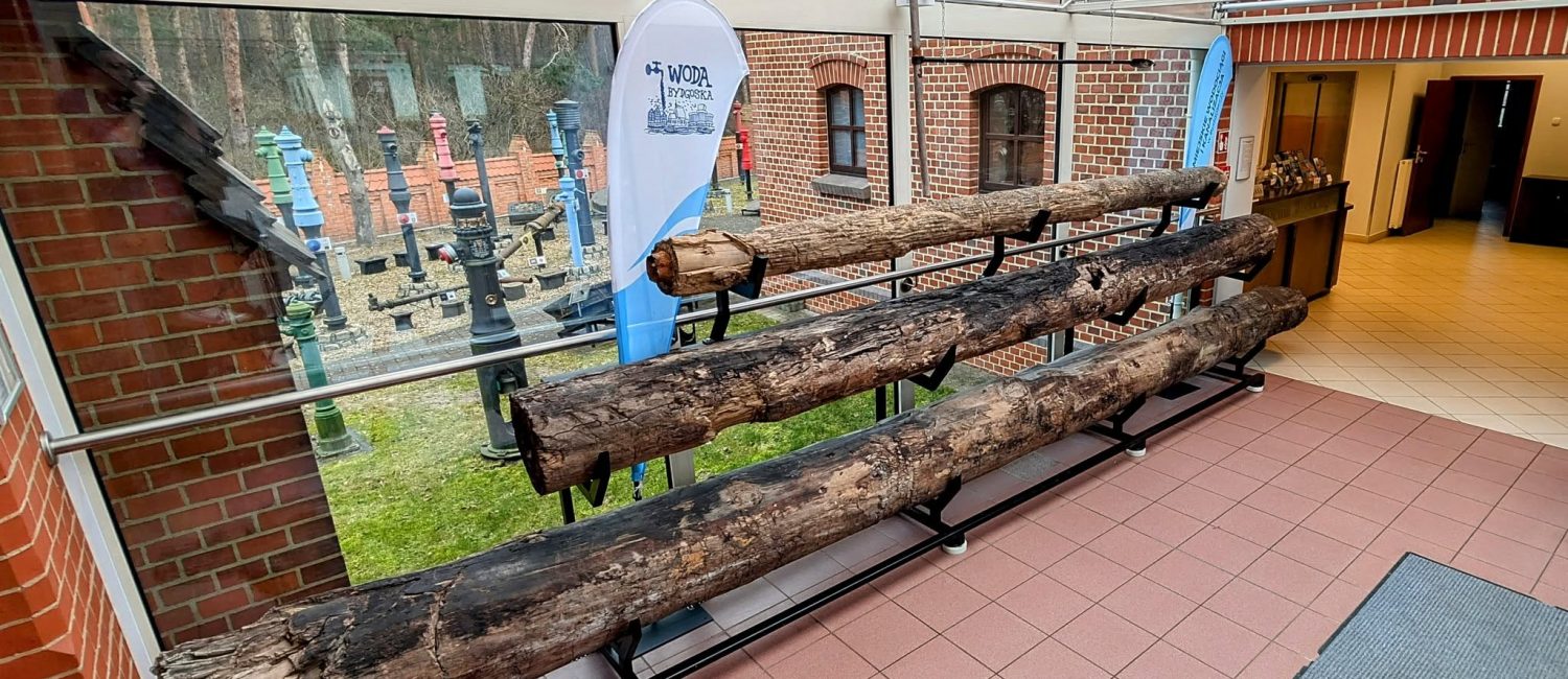 Otóż w szklanym łączniku wiodącym do kasy i sklepiku muzealnego stoją na specjalnej konstrukcji trzy drewniane rury wodociągowe w hierarchii od najstarszej do najmłodszej.