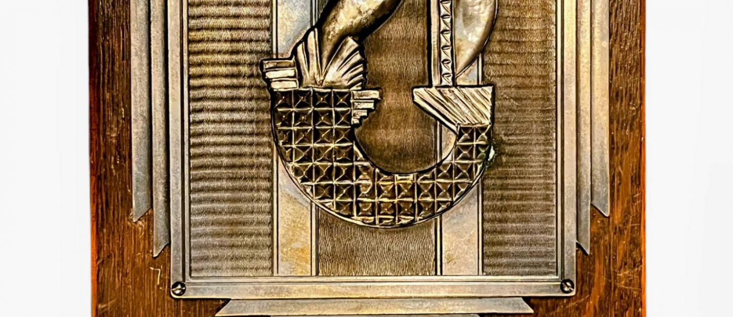 Co ciekawe, to właśnie pomniejszoną wersję syrenki warszawskiej Golińskiego z fasady budynku filtrów umieszczono na prezentowanej przez nas tabliczce. Za syrenką znajdują się trzy pionowe „filary”, które mogą nawiązywać do wody przepływającej przez złoża piaskowo-żwirowe wykorzystywane w procesie oczyszczania wody w Zakładzie Filtrów Pospiesznych.