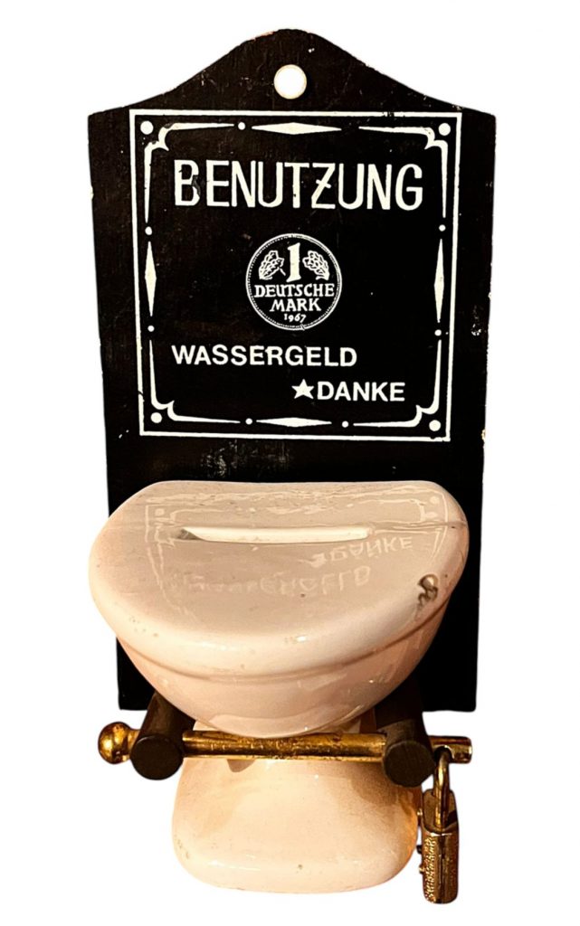 Napisy informują, że za korzystanie z wody należy uiszczać opłatę wysokości jednej marki. Niestety nie wiadomo, gdzie owa skarbonka pierwotnie funkcjonowała. Mógł być to na przykład szalet miejski, łaźnia, lub punkt poboru wody, gdzie można było się np. umyć lub pobrać wodę.
