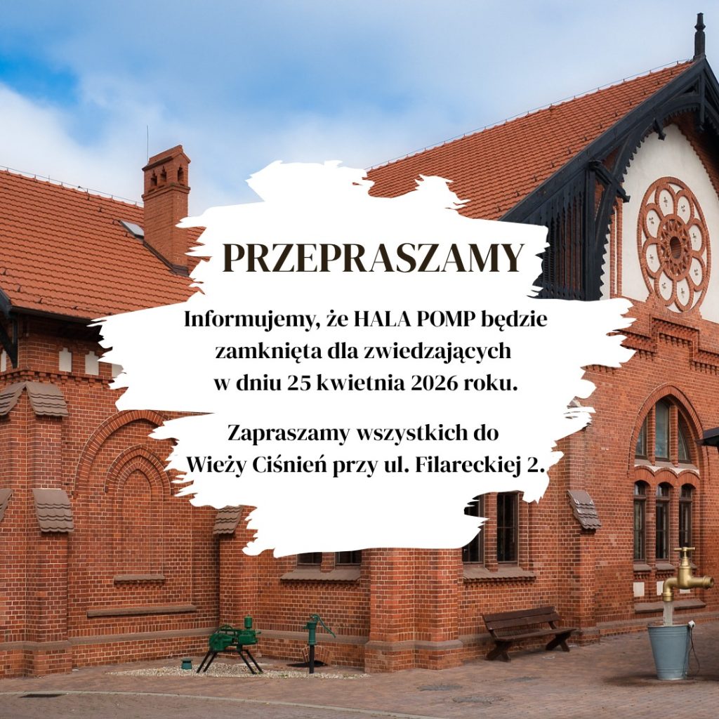 Informujemy, że w najbliższą sobotę (25 kwietnia) Hala Pomp będzie niedostępna dla zwiedzających. Zapraszamy Was serdecznie do odwiedzenia Wieży Ciśnień przy ul. Filareckiej 2, gdzie czekają na Was niezapomniane widoki i historia.