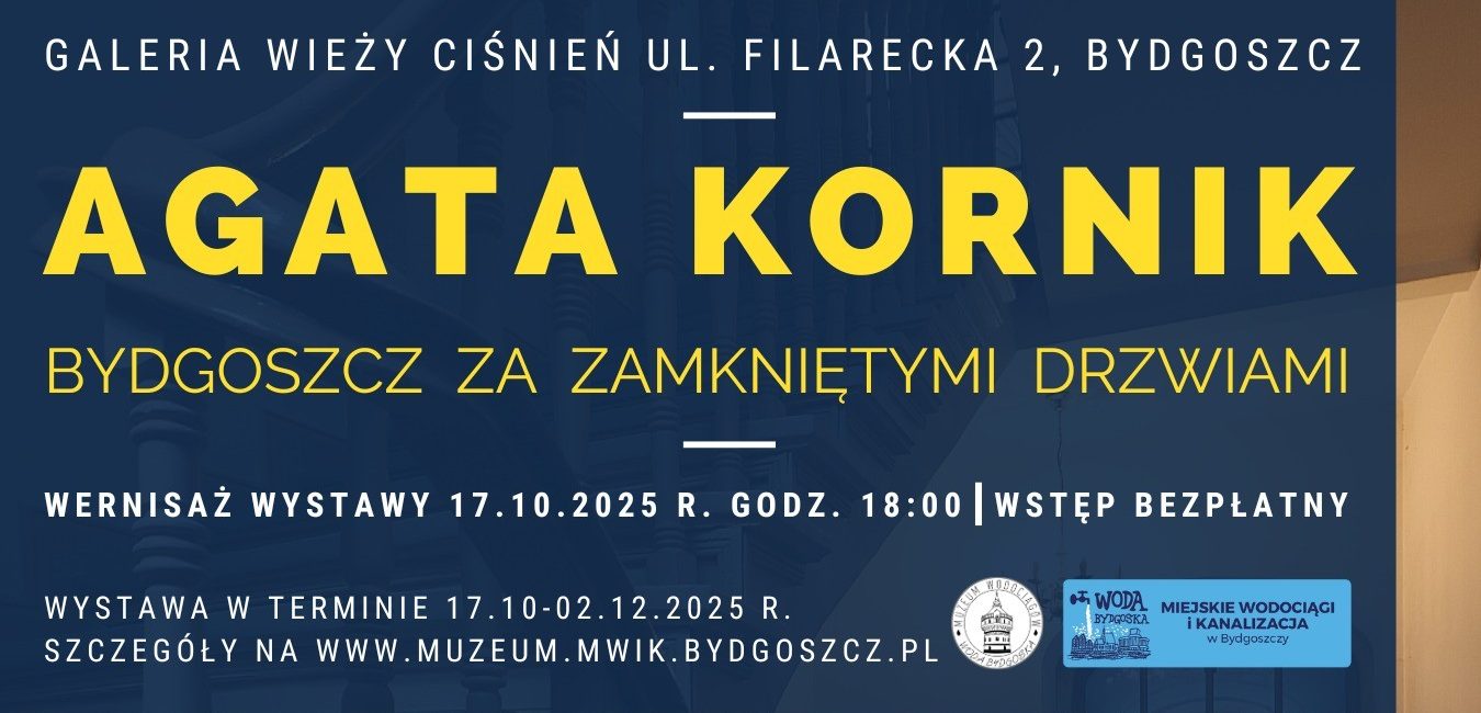 Galeria Wieży Ciśnień zaprasza na najnowszą wystawę, w przestrzeni dawnego zbiornika wodnego w Wieży Ciśnień, przy ul. Filareckiej 2 w Bydgoszczy. Od soboty 18 października do wtorku 2 grudnia 2025 roku, w godzinach otwarcia Muzeum Wodociągów, będzie można podziwiać prace Agaty Kornik na ekspozycji pt. „Bydgoszcz za zamkniętymi drzwiami”.