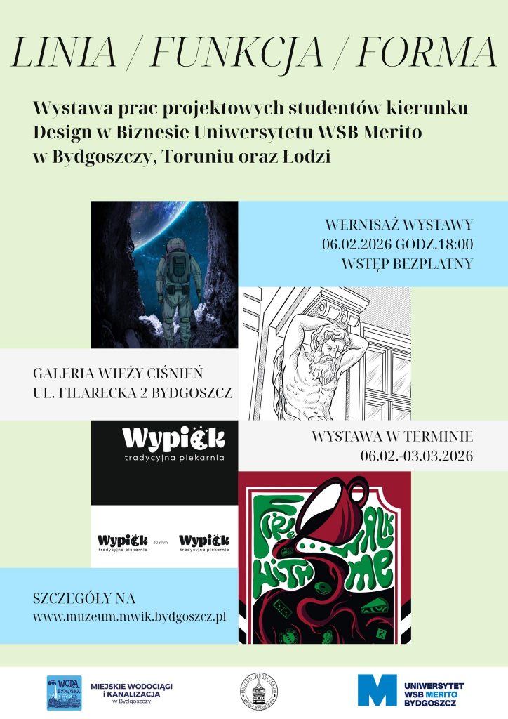 Galeria Wieży Ciśnień zaprasza na najnowszą wystawę w przestrzeni dawnego zbiornika wodnego w Wieży Ciśnień, przy ul. Filareckiej 2 w Bydgoszczy. Od soboty 7 lutego do wtorku 3 marca 2026 r., w godzinach otwarcia Muzeum Wodociągów będzie można podziwiać ekspozycję prac projektowych studentów kierunku Design w Biznesie Uniwersytetu WSB Merito w Bydgoszczy, Toruniu oraz Łodzi pt. „Linia / Funkcja / Forma”. Wernisaż tej wystawy będzie miał miejsce w piątek – 6 lutego 2026 r. o godz. 18:00. Wstęp wolny.