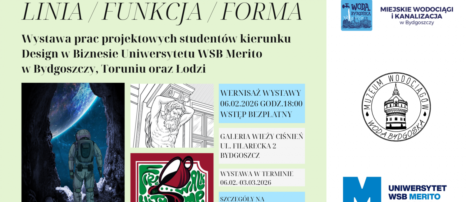 Galeria Wieży Ciśnień zaprasza na najnowszą wystawę w przestrzeni dawnego zbiornika wodnego w Wieży Ciśnień, przy ul. Filareckiej 2 w Bydgoszczy. Od soboty 7 lutego do wtorku 3 marca 2026 r., w godzinach otwarcia Muzeum Wodociągów będzie można podziwiać ekspozycję prac projektowych studentów kierunku Design w Biznesie Uniwersytetu WSB Merito w Bydgoszczy, Toruniu oraz Łodzi pt. „Linia / Funkcja / Forma”. Wernisaż tej wystawy będzie miał miejsce w piątek – 6 lutego 2026 r. o godz. 18:00. Wstęp wolny.