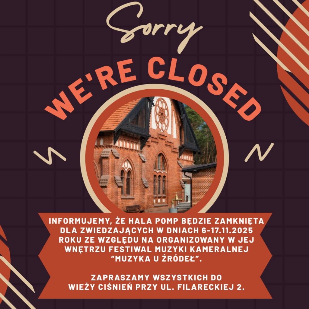 Informujemy, że HALA POMP będzie zamknięta dla zwiedzających w dniach 6-17.11.2025 roku ze względu na organizowany w jej wnętrzu Festiwal Muzyki Kameralnej “Muzyka u Źródeł”.